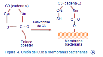 Después tanto el C4 como el C2 se fraccionan y sus fragmentos terminan formando el C4b2b. Este complejo actúa sobre el factor C3 que se transforma por proteólisis en un fragmento C3a y otro C3b el cual se une a la membrana celular. El germen se ve progresivamente rodeando por miles de fragmentos C3b para el cual tienen receptores los macrófagos. Estos erminan fagocitando y destruyendo en lo que constituye el mecanismo de muerte más importante del complemento (Figura 8).