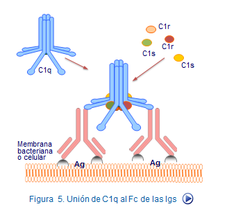 El factor C1 está compuesto por tres subunidades proteicas, C1q, C1r y C1s con funciones diferenciadas (figura 6). Lasubunidad C1q es la encargada de fijarse al extremo Fc del anticuerpo (Figura 7). C1q activa a la otra molécula C1r. Dos moléculas de C1r aracan a dos moléculas de C1s, activándolas y convirtiéndolas en una enzima del tipo serin-proteasa cuyo substrato son los factores C2 y C4.