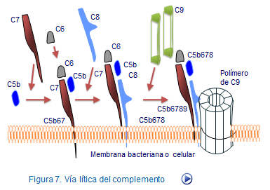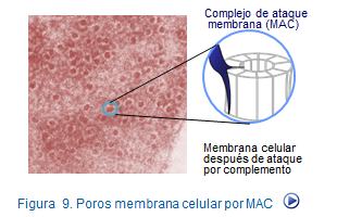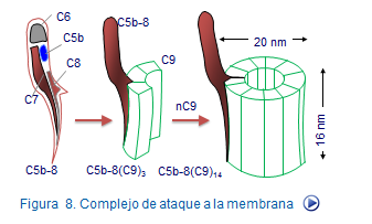 Si al complejo C5b67 se une la fracción C8, el complejoC5b678 adquiere capacidad citolítica gracias a que C8 modifica su configuración espacial para ofrecer zonas hidrofóbicas que facilitan su inserción en la membrana. Este complejo adquiere capacidad para interactuar con el factor C9 formando el complejo C5b6789. Este complejo recibe el nombre de complejo de ataque a la membrana (MAC) (Figura 10).