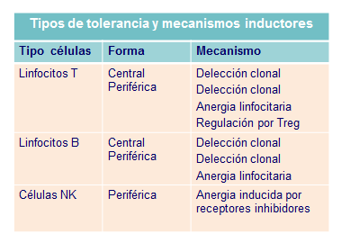 Hoy sabemos que la tolerancia forma parte consustancial de la respuesta inmune e incluso conocemos sus características, que se pueden resumir en cuatro puntos: especificidad frente a cada antígeno, que es de carácter duradero y que se induce en el proceso madurativo de los linfocitos, tolerancia central, pero también en linfocitos ya maduros a nivel periférico,tolerancia periférica. Todo ello par evitar reacciones de autodestrucción del organismo por linfocitos autorreactivos donde asientan (Tabla: Tipos de tolerancia).