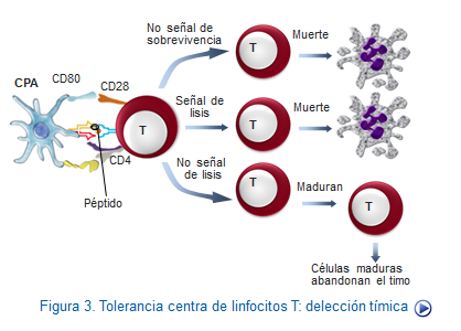 Las células T se tolerogenizan en el timo en donde consiguen madurar sólo los linfocitos no autorreactivos. Este proceso se lleva a cabo en dos fases aparentemente contradictorios: la selección positiva de aquellos timocitos (futuros linfocitos) cuyo receptor es capaz de reconocer las moléculas propias presentadas por el HLA y la selección negativa que consiste en la eliminación de las células T autorreactivas, tal como se ha visto en capítulos anteriores (Figura: Tolerancia T central).