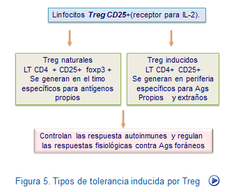 Células Treg naturales. Estas células que se caracterizan por ser CD4+CD25+ FOXP3 +, dependientes de IL-2 y desempeñan un papel central en el mantenimiento de la tolerancia a nivel periférico frente a antígenos propios. Representan un 10 % de los linfocitos T CD4+ y su ausencia se asocia con la presencia de enfermedades de tipo autoinmune. Su acción consiste en inhibir la producción de citocinas por las células Th1, Th2 y CTL mediante la liberación de IL-10 y TGF-beta (Figura: Tolerancia por Treg).