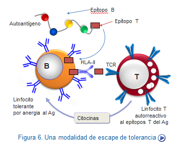 2. Fuerte activación de linfocitos B anérgicos por linfocitos T autorreactivos. En el caso especifico de las células B, como veíamos anteriormente, necesitan para su completa activación la ayuda de los linfocitos T, por lo que aunque existan clones autorreactivos de células B, basta con que no lo sean los clones de linfocitos T que reconocen el mismo antígeno (aunque distintos epítopos), para que éstas se vuelvan anérgicas. Sin embargo, en algunos casos se producen mecanismos de escape de la tolerancia. Esto se debe a que las células B autorreactivas pueden reconocer epítopos de un antígeno que contiene otros epítopos reconocidos por las células T, con lo que al procesar y presentar esos epítopos a las células T éstas se activan y mandan segundas señales a los linfocitos B, suficientemente intensas que hagan que salgan de su estado de reposo y pasen a una nueva situación de autorreactividad (Figura: Escape tolerancia B).