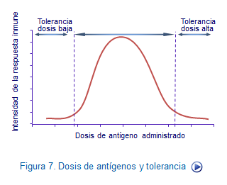 2.Cantidad de antígeno administrado. Sabemos como dosis muy bajas o muy altas de antígenos inducen tolerancia mientras que existe una dosis media que depende de cada uno de los antígenos, que son capaces de inducir respuestas inmunes intensas (Figura: Ag y tolerancia).