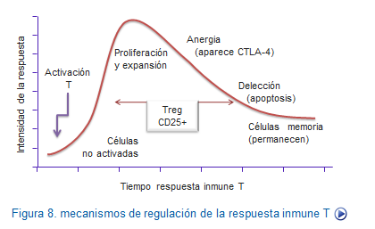 Además, es conocido como a lo largo de una respuesta inmune frente a un estímulo, después de una fase de máxima expansión celular, se produce otra en la que van despareciendo muchas de las células formadas (delección). En este declive interviene las células Treg e inductoras del proceso de apoptosis y muerte, con lo cual disminuye la cantidad de células, quedando sólo las células memoria (Figura: Regulación T).