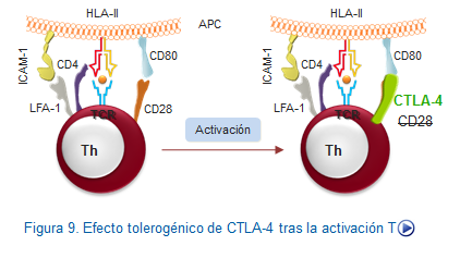 En concreto, en estadios finales de la respuesta inmune se activa la producción de CTLA-4 que posee mucha mayor afinidad por el CD80 que el CD28, pero su unión al CD28 no produce activación celular. De eta manera el organismo mediante su producción evita de manera fisiológica la estimulación de los linfocitos T, dejando a estas células sin la segunda señal. La molécula PD-1 actuaría de una manera equivalente al CTLA-4. Este es el fundamento de la utilización en terapias clínicas de "CTLA-4 soluble" para bloquear al sistema inmune, como veremos después. (Figura: Terapia con CTLA-4).