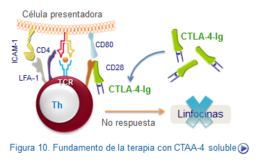 6.Bloqueo de moléculas coestimuladoras. La estrategia de bloqueo de moléculas estimulantes se suele utilizar para bloquear la respeta inmune en situaciones clínicas graves. Uno de estos procedimientos es el bloqueo del receptor CD28 por CD80, administrando CTLA-4 recombinante fusionado a un dominio de inmunoglobulina (CTLA-4Ig), como veremos al final de este capítulo. El bloqueo de la coestimulación asociado a determinadas terapias inmunosupresoras está abriendo la posibilidad de inducir tolerancia duradera en pacientes trasplantados, lo cual permitirá disminuir, e incluso interrumpir a medio plazo, las terapias inmunosupresoras, evitando los efectos indeseables asociados a las mismas.